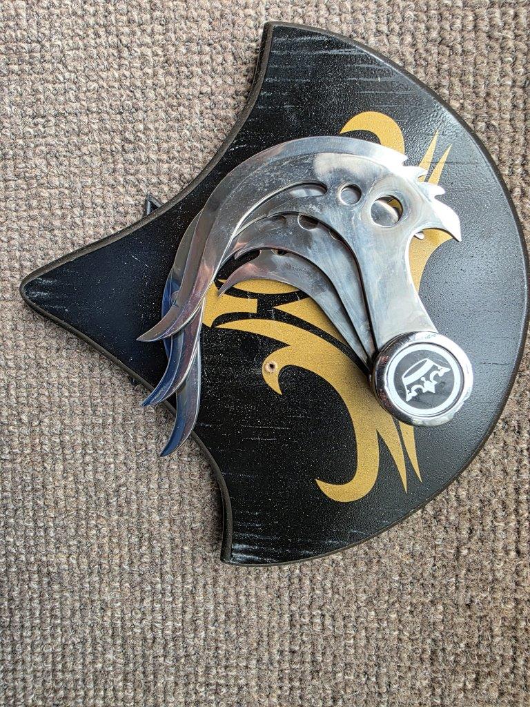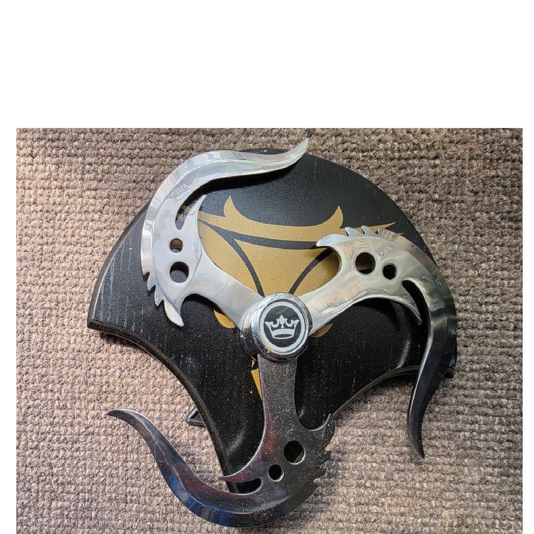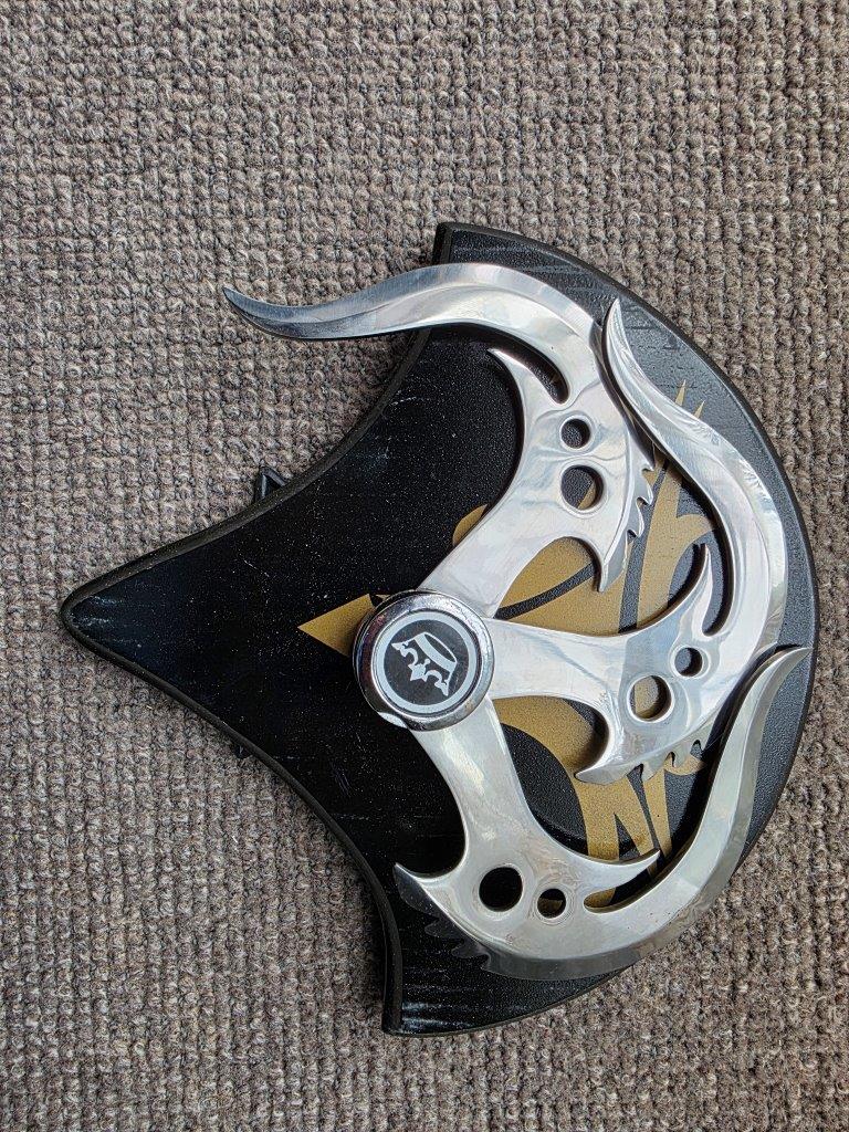 This feace weapon is manufactured of mirror polished, 420 stainless steel and has a hidden release button on the back, which allows this magnificent knife to fold exactly like its movie counterpart.