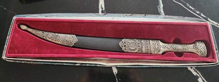 Double Edged Short Sword only 49cm is length comes in presentation box has secure cast matching scabbard blade is sharp