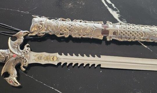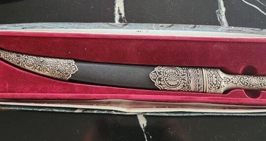 1933 to 36 issued Offiicers German SS –SA Dagger with black composition handle features ebony handles with an SS symbol insert located just below the pommel. In addition, a small eagle holding a swastika is placed on the center of the handle. The fittings are manufactured from brass metal. The black me It has a deeply etched motto inscription is found on the obverse side of the blade. This inscription reads “Meine Ehre heist Treue” which translates to “my honour is loyalty”. On the reverse side it reads in circular Inscribed on the blade is the name “Robert Klaas” and “Solingen”. there is also a small image of what appears to be a Knight in Amourtal sheath features nickel-plated fittings. 15″ overall.