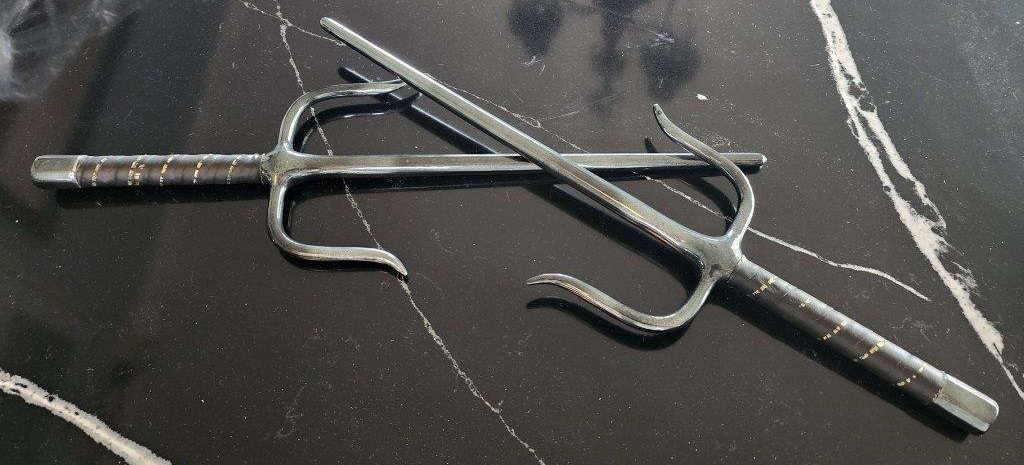 Blade: The blade of the Sai are stainless steel with a hexagonal design. The tip of the Sai is unsharpened.