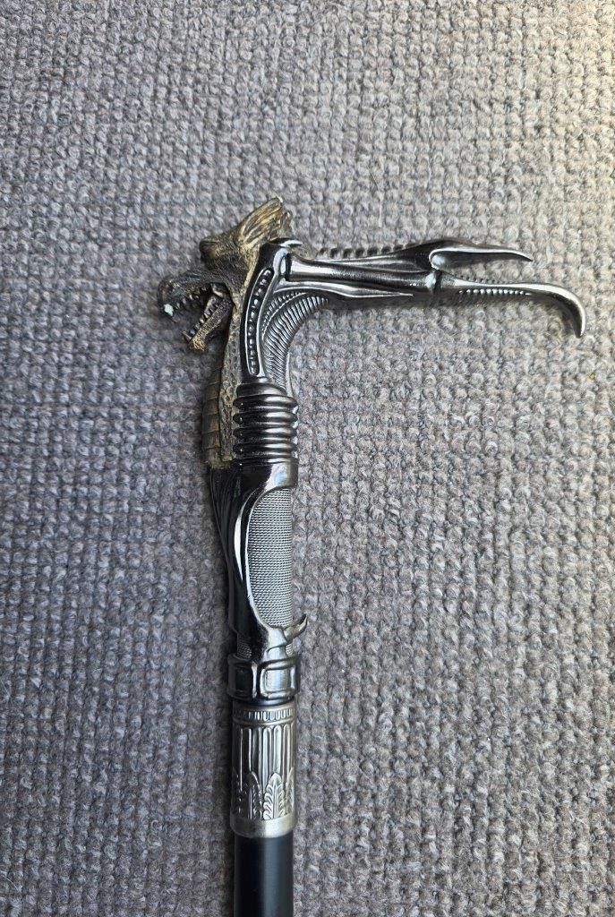the handle is a solid Bronze cast metal Dragon head and holds a 40cm double sided blade